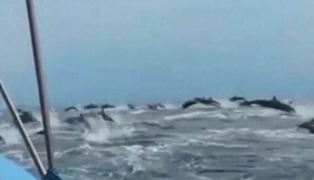 In the video filmed by Orlando Marin, the dolphins are seen leaping out of the water on both sides of the boat and underneath it, splashing around in the horizon as far as the eye can see.